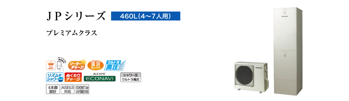 主な機能 ●エコキュート専用アプリ ●無線LAN搭載コミュニケーションリモコン(台所リモコン) ●ステンレス配管採用 ●電気料金プランかんたん設定 ●ピークセーブ ●ダブルピークカット ●ピークシフト設定 ●ソーラーチャージ ●温浴セレクト ●AIエコナビ ●リズムeシャワープラス ●ぬくもりチャージ ●うっかりアシスト ●配管洗浄 ●キレイキープコート ●ダブル真空断熱材 ●4本脚 耐震設計技術 ●ECHONET Lite AIF認証対応 ●AiSEG3対応 ●昼間沸き上げ停止 ●給湯ガイド ●自動お湯はり ●自動保温・自動たし湯 ●追いだき ●たし湯・高温たし湯 ●シンプル画面 ●入室サイン
