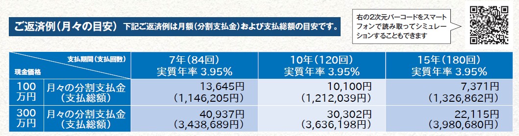 | 支払い期限(回数) | 6か月から15年(6回から180回)※太陽光発電システム単体は216回まで可能 | ||
